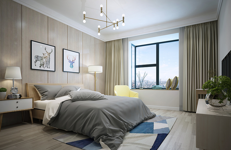 3:北歐風格的空間不是千篇一律的黑白色,原木與素色也可以打造簡潔北歐風的卧室,原木與素色融合,讓主卧顯得簡約而明亮,而藍色窗簾的采用點綴了空間。