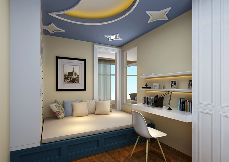 7.這(zhè)款地中海風格的榻榻米适合小孩的房間,用月亮和星星吊頂,俏皮又可愛。地櫃用深藍色,牆壁用米黃色,溫馨又時(shí)尚。