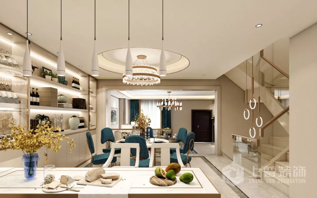 餐廳延續了客廳的整體色調,融合了通道(dào)空間,大大提升了空間的利用率。餐廳裡(lǐ)每一個角落都(dōu)是經(jīng)過(guò)精心布置的,精緻的燈具,舒适的餐椅,整齊的餐具, 每個角度都(dōu)折射出如夢似幻斑斓采光。
