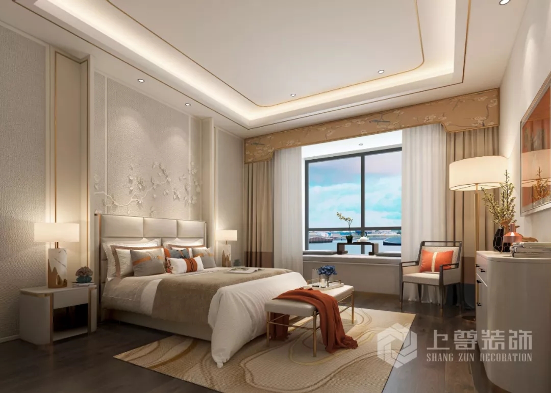 卧室中頗有中式混搭的既視感,延續餐廳與客廳的主色調不變,增加了吸人眼球的精緻中式風裝飾物,牆面(miàn)的質感枝條、與床頭櫃上的金屬質感的台燈,既精緻又華麗,梳妝台的花瓶既可以展示綠植,給房間帶來清新之氣,又可以作爲藝術品融入整個房間之中。