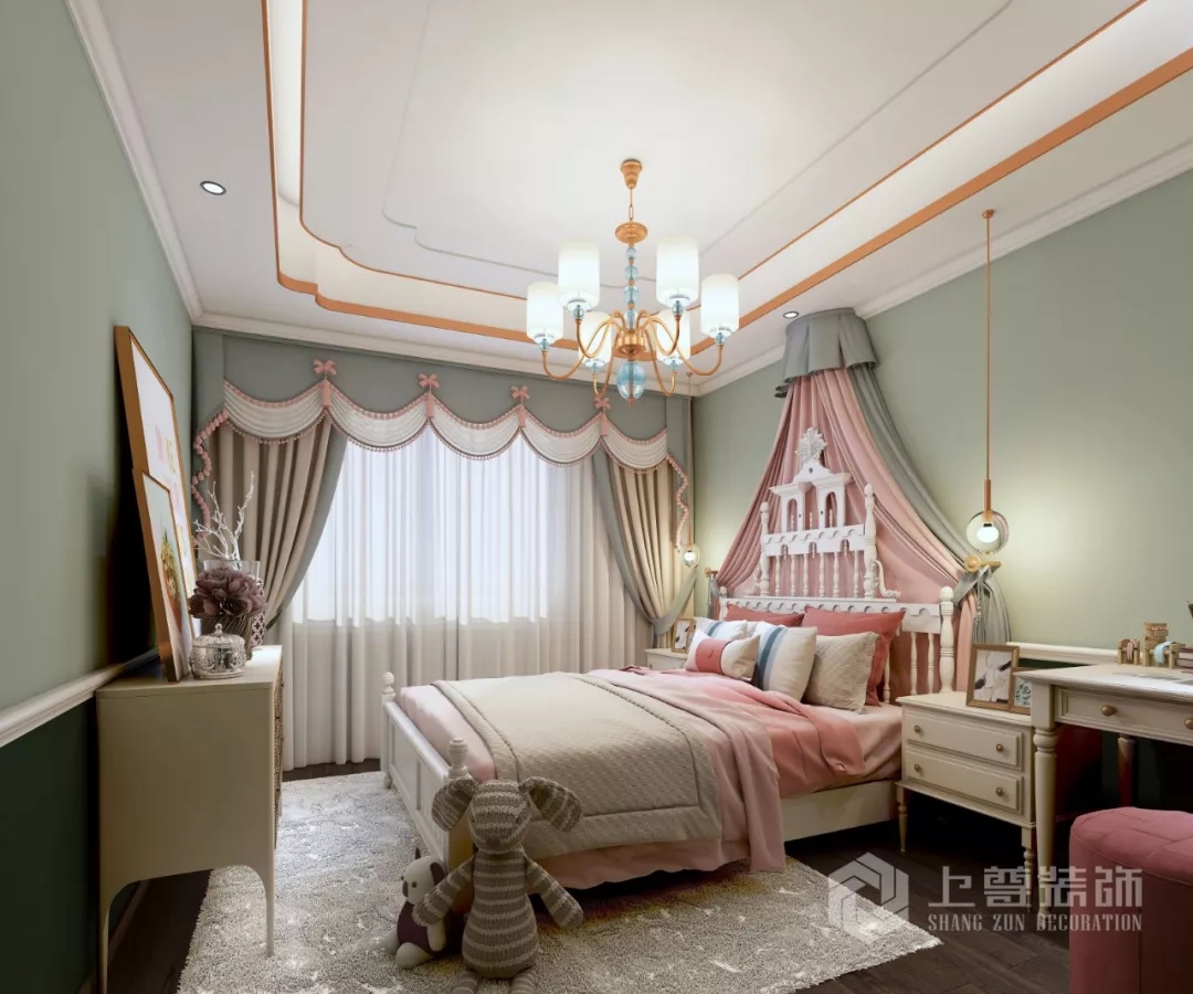 女兒房作爲套房,是小公舉休息和學(xué)習的空間,屋頂在顔色搭配上延續全屋整體色調,增加了設計的整體感;床和背景采用了粉紅與綠色結合,使空間不失活潑,童趣的特質,增加了整個空間的視覺沖擊。